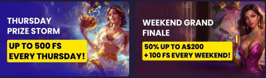 | Reloads | A deposit deal available after making an initial payment. | Claim a 50% match up to AU$200 and 100 spins with Weekend Grand Finale. |